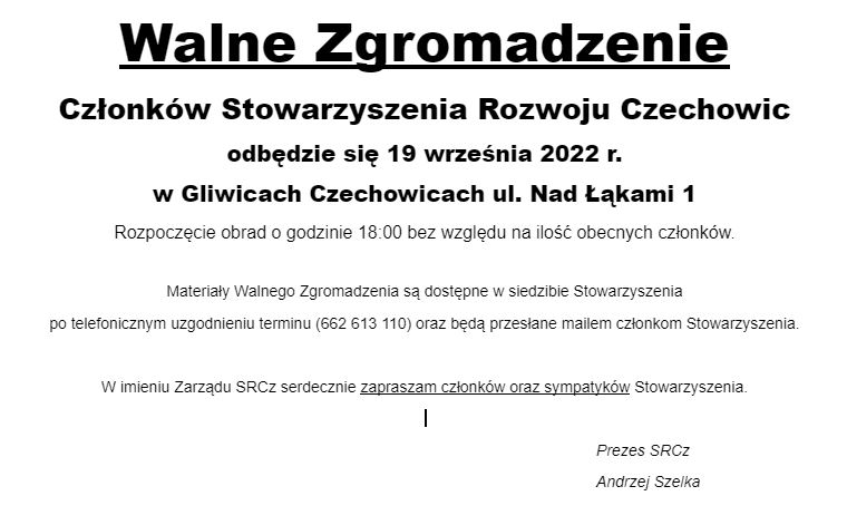 Walne Zgromadzenie Członków Stowarzyszenia Rozwoju Czechowic odbędzie się 19 czerwca 2019 roku o godzinie 18:00 (I termin), a w razie braku kworum o godzinie 18:15 (II termin) w Starej Szkole w Gliwicach Czechowicach przy ul. Nad Łąkami 1.